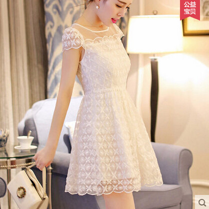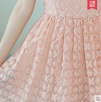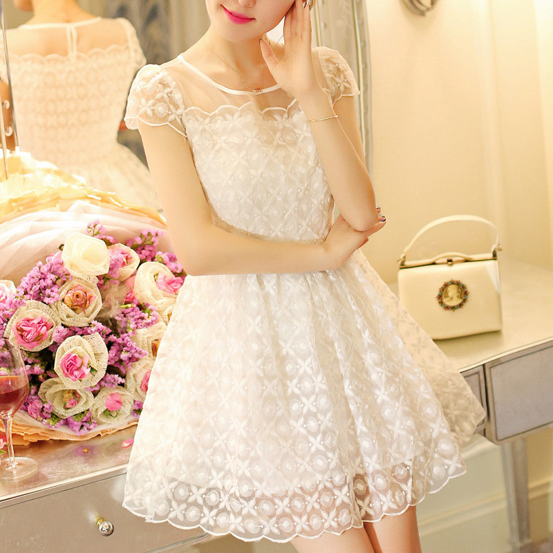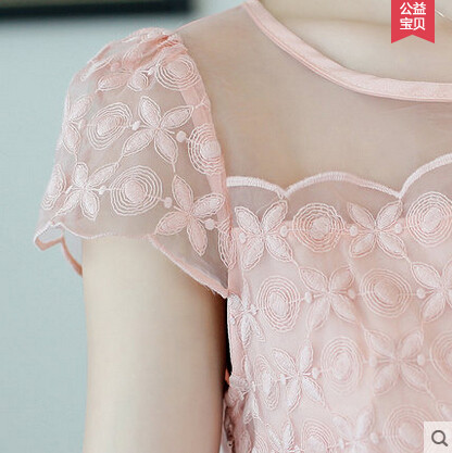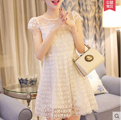 • 商品名称:荷叶边欧根纱刺绣短袖镂空蕾丝连衣裙 夏韩系小香风短裙A字连衣裙